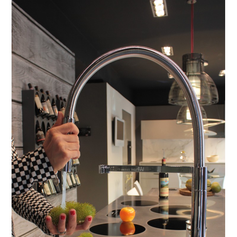 Kuhinjska pipa z enojnim ročajem s pomičnim visokim izlivom, vrtljivim 360 °, snemljivim tušem z dvema curkoma.