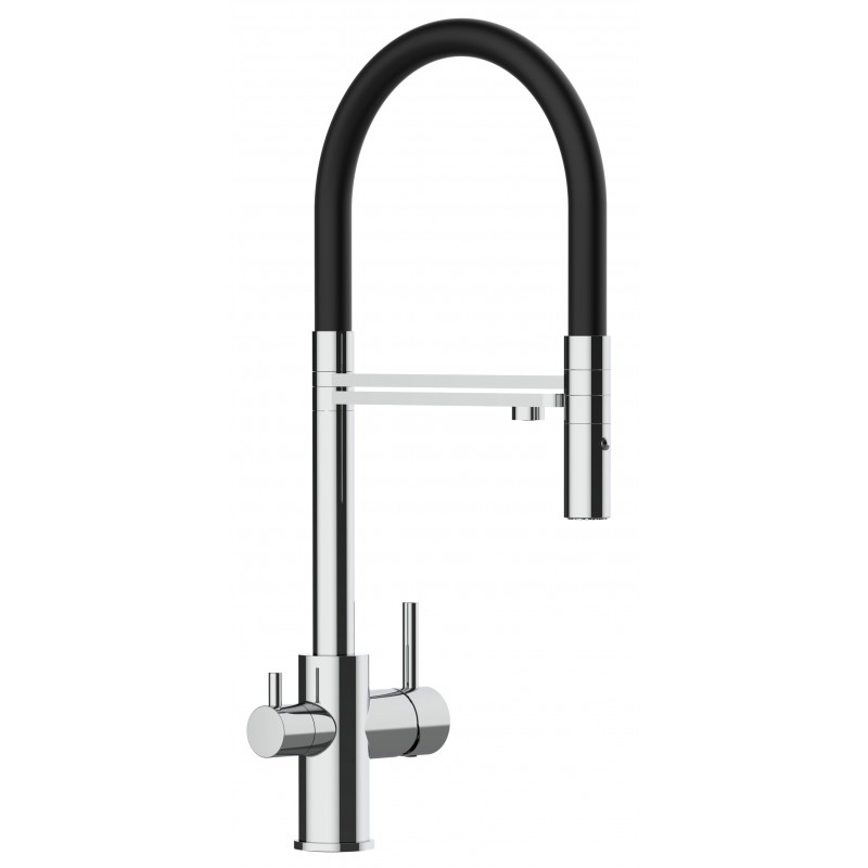 Trosmerna kromirana kuhinjska pipa s pomičnim barvnim izlivom 2-curkoma in izvlečnim tušem za uporabo s čistilnim filtrom.